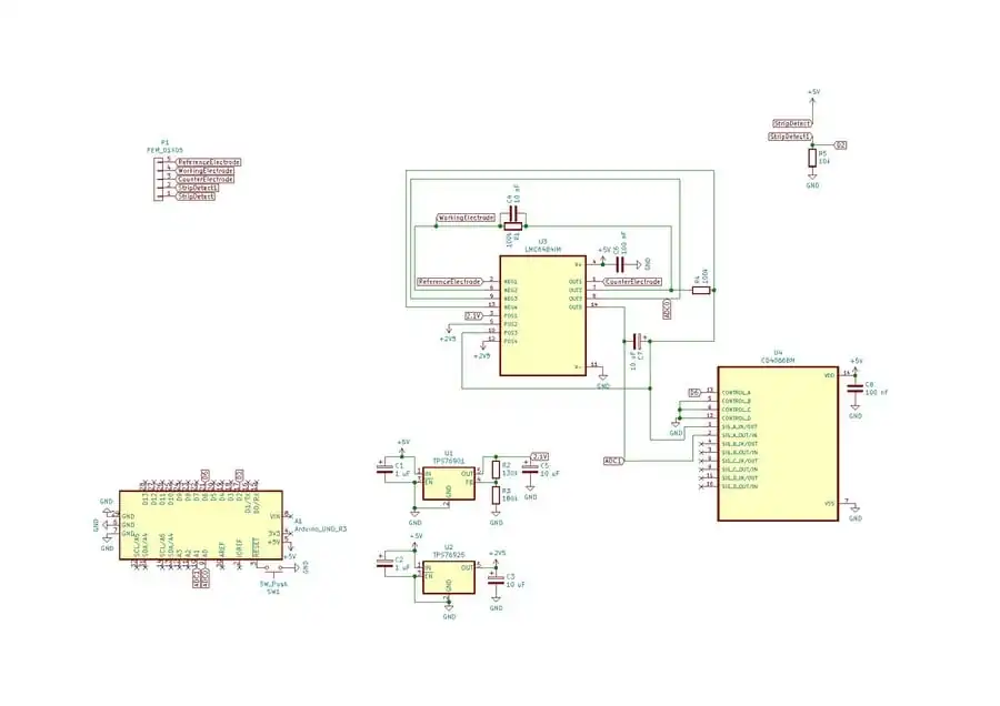 In this schematic the test strip is connected to a quad op amp integrated circuit which feeds into an Arduino Uno. This is a circuit designed by M. Bindhammer and will serve as a basis for our design. We would like to add temperature compensation, data storage, and a clock to the existing design.