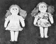 If materials were available, these homely dolls could be made more elaborate. Unneeded scraps of fabric replaced the paper clothing and extra yarn was used for hair. The ordinarily plain dresses acquired overskirts of gathered fabric with ribbons and bows at the waist. Pieces of felt, fabric and beads were the facial features and gathered hats topped off the dolls.