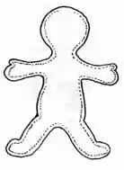 Ozarkians of the early 1900's made many toys from the materials around the house such as rags or scraps of fabric. Little girls loved their big, floppy dolls made from the larger pieces of canvas or muslin and attired in dresses made from their own worn-out clothing. To make a simple doll like many girls used to have, cut out two pieces of white or unbleached fabric, one for front and one for the back, using the basic pattern. (Ill. 1) This pattern can be made any size desired. Then with right sides together, stitch around the edges, leaving a small opening at the top of the head. Turn the doll right side out and stuff. The stuffing, used in minimum amounts for the floppy dolls, was usually rags, old socks or cotton, but shredded foam is in common use now. After stuffing, close the opening by hand stitching. To complete the doll the face was embroidered or painted on with the features designed by the little "mother."