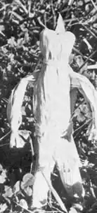 The corn husk dolls took longer to make than the cob dolls because the husks had to be softened in water first. When they became flexible enough to work with, the husks were fashioned into dolls resembling Indians or Pilgrims. To make a doll soak husks overnight. Gather five or six husks together and trim the ends. Lay the husks on top of one another with the curved ends lying the same direction. The curved ends are those that had been attached to the cob. Place two or more husks with the curve in the opposite direction. Tie close to the top edge with twine. To form the head, bend the entire length of the two groups of husks down over the twine in opposite directions. The bend must be made immediately above the twine. (Ill. 5) This forms a rounded head with a thin hole at the top. Tie a strip of folded husk around all the husks about 1" from the top to designate the neck.