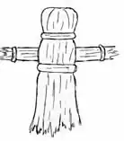 The male doll's legs are tied in three places. These ties designate the hips, ankles and feet. The feet must be pinned into shape until the husks are dry.