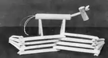 Raiding Mother's sewing box often yielded empty wooden spools from which numerous toys were made. A tractor was one easily made spool toy. These tractors rolled swiftly across the floor, yet didn't need batteries or electricity--only a rubber band. To make a spool tractor cut notches around the rims of the spool to represent lugs, and insert a rubber band the length of the spool through the hole. Secure the band at one end by sticking a short section of a match stick through the loop. For the other end, first carve a piece of hard soap slightly smaller than the spool and about 1/4 inch thick. This serves as a lubricant when the spool turns. Cut a small hole in the center and insert the rubber band through this hole. Secure the band with a match stick that extends far enough from the spool to wind up and then act as a drag to guide the tractor.