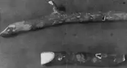The smaller stalks are placed in holes cut into the body. The arrows show the position of the legs, neck and head.