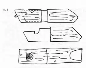The whistles have to be made in the spring when the sap is rising so that the bark slips off easily. Cut the twig from the tree diagonally on both ends. (Ill. 9) To make the slit that forms the whistle hole, cut a V shaped hole through the bark and into the wood about one inch from one end. Then carve a ring around the middle of the twig just deep enough to cut through the bark. Twist the bark off carefully so that it doesn't break. Carve the V shaped hole deeper into a half moon shape and also make a shallow horizontal cut from the slit to the end of the twig. Finally replace the bark and the whistle is complete. After drying, the bark usually can't be removed. Despite Mother's disapproval of these cheerful little toys, children blew them constantly indoors and out.