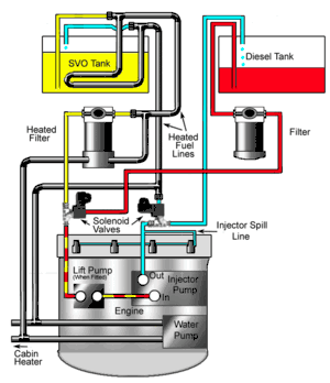 A simple and effective way to safely run a diesel engine on vegetable oil is to use a twin tank or bi-fuel system.[1][2] The engine is started on diesel fuel (or another starting fuel) and when the engine has run for a while and warmed the fuel supply is switched from this starting fuel to vegetable oil. This avoids running vegetable oil through a cold engine at start up.