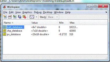 ) or F5. After a few seconds, you should see three data arrays in the MATLAB Workspace Toolbar named as 'pv_database', 'chp_database', 'batt_database'.
