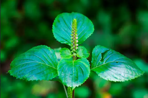 One form of perilla has green leaves with white flowers. Another form of perilla has crinkly reddish-purple leaves with pinkish-mauve flowers. The leaves are large and ovular in shape.