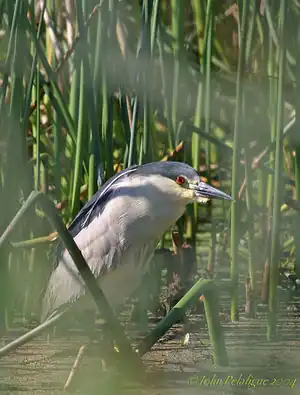 | Black-crowned Night Heron: (Fig.3) | 23-28", wing span 3'8". Medium sized, short and stocky. Black crown and black back. Grey wings and white underparts. Black, short bill, pink/yellow legs. Plumes appear on back during breeding season. | loud, barking kwok! Quawk! In the evening or night time. Harsh calls. | 3-5 blue/green eggs found in thicket or reeds, rarely put into trees. | Pacific Coast through Canada and US. Mid-western states, and east coast of U.S. Not found in Rockies. |