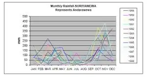 As an example, the rain fall pattern in Suriyawewa divisional secretariat, in Hambantota district is shown in figure 1, which clearly highlights that rain is mainly received during the four months; March - April and October - November.