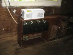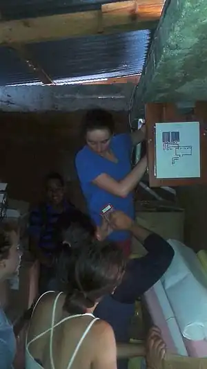 | June 16 | The old inverter in Ghetto2Garden was mutilated by rats and Tomas gave the old inverter to Tito in order to get it fixed at SM Electronica. Today the team went to Ghetto2Garden with the fixed inverter in order to fix the system, as it was rewired while Tomas was away the system had to be assessed and it was found that the batteries were not wired correctly and had to be rotated and corrected. The charge controller was not working either and had to be removed from the system to be taken back to Santo Domingo for repair. The wires from the lightning arrestor to the breakers, charge controllers, and the batteries had to be removed in order to be rewired efficiently before returning to Ghetto2Garden. | ![]() |