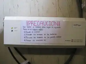 | June 2 | The team met with the administration at La Yuca to gain permission to test the system by draining and recharging the batteries. Administration in La Yuca have addressed that we need to make sure we give a hands-on tour of the solar panel system once we have finished so they can address any future problems and/or educate the children in order to prevent them from possible destruction. They stated that the inverter has not been outputting power and that it was smoking in April. The team used a multimeter to measure the voltage. The batteries were at 12.86V and the inverter was at 1.2 amps. The inverter was removed from the storage room in order to have it repaired. | ![]() |
