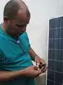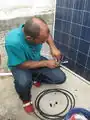 | June 28 | Today was the third and final day of the solar workshops.The participants connected the components in order to connect the system. Ultimately, they were able to get the system to run and power a fan, which was the highlight for Junior, the youngest participant in the workshop. During this hands-on workshop the participants began questioning each other on what each component did and how to wire it and everyone was pitching in to answer it.The system hd to be taken down and put into Enrique's house as the Botica did not have doors at that time. | ![]() |