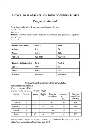 This project is a follow-up to the solar panel systems installed in La Yuca and Ghetto2Garden, in addition to the installation of a new system completed in Las Malvinas. The following page will cover system assessments, costs, and how to install a system. The background goes into the past projects, as well as problems faced by the solar team. The literature review outlines information specifically for PV solar panel systems and some information on education matters, as the solar team involved the community in the installation process. The timeline displays the daily tasks of the project followed by the budget. In the last portion of the page, there is a guide explaining the installation of the Las Malvinas system.