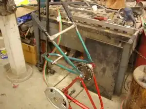 To build the frame you will need two bicycles. At least one should have functionally rotating pedals, wheels, and crank at the bottom bracket. The other bicycle need only contain a frame and handlebars; it will be referred to as the "scrap bicycle" and used as framing material. For the frame, most of the support pieces are welded to the main frame. The rear support is mounted to the rear axle position thereby two rear bicycle frame components are mounted to the same rear axle.