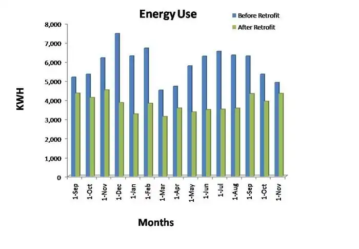 By adding up the all the KWh for the 20 months before June, 2008 (date of retrofit) and then dividing by 20, the average monthly energy use can be calculated, the same process can be used to find the average monthly energy use for the 15 months after the retrofit. The average energy use before the retrofit was 6,092 KWh per month, after the retrofit the average energy use was 3,803 KWh per month, a 2,289 KWh per month savings, and a 37% energy reduction. The retrofit saves an average of $381 dollars a month, and $4,572 dollars per year (Calculations based on average cost of $0.166 per kWh). The installation cost was $7,695 which was paid for by grants, if the American Cancer Society would have had to pay for the installation it would have took 1.6 years for the energy savings to pay for the installation. This means the American Cancer Society Humboldt-Del Norte unit on average saves 27,468 KWh and 13.73 standard tons (27,460 lbs.) of Carbon Dioxide per year (assuming one pound of CO2 per KWh). RCEA estimated the retrofit would save $2,544 per year and reduce the energy use by 15,260 KWh per year, so the retrofit was about 44% more effective than initially estimated.