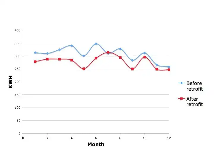 The overall outcome of the retrofits resulted in some savings, however they were less than the RCEA predicted. The average monthly KWH usage for the year prior to the retrofit (10/2007-9/2008) was 308 KWH, which amounts to about 162 lbs of CO2 produced per month (Table 1). The average monthly KWH usage the year following the retrofit (10/2008-9/2009) was 278 KWH, which amounts to about 146 lbs of CO2 per month (Table 1). This was calculated by finding the average KWH usage from September 2007 to August 2008 and comparing it with the average KWH usage from September 2008 to August 2009. To find the CO2 emitted, the average KWH use was multiplied by 0.5246lbsCO2/KWH. To find the monthly savings KWH was multiplied by the rate $0.16716/KWH. This is a yearly reduction of about 192 lbs of CO2 (Table 2) or a 10% reduction in energy use. The actual yearly KWH reduction this far has been 28% of that predicted by RCEA. Part of this smaller energy reduction can be attributed to the higher wattage of bulbs used, compared to what RCEA based their estimates on.