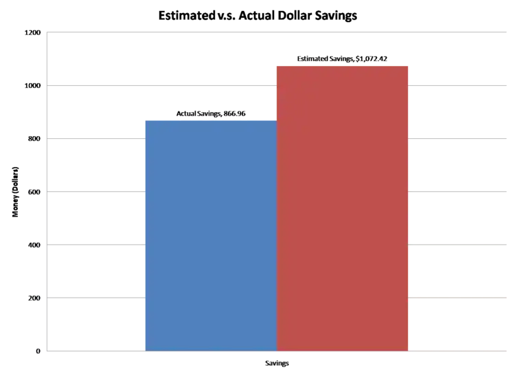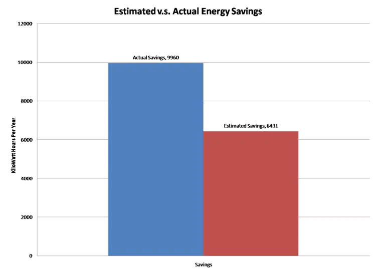 The retrofit was successful in the goals of conserving energy and saving money, but did not meet the estimated dollar savings originally set by RCEA at the completion of the Retrofit. The estimated savings was $1,072.42 per year. In the first full year (Aug. 2008- Aug.2009) the actual savings was $866.96. That is a difference of $205.46 in the first year. The actual energy savings did however exceed the estimated energy savings of 6,431 kwH/year. In the first full year (Aug. 2008-Aug. 2009) the actual savings was 9,960 kwH/year. This data shows that the price of electricity was most likely higher when RCEA was making estimations than it is currently because there was more energy saved then estimated but less money saved. All of the results are expressed in Table 1.