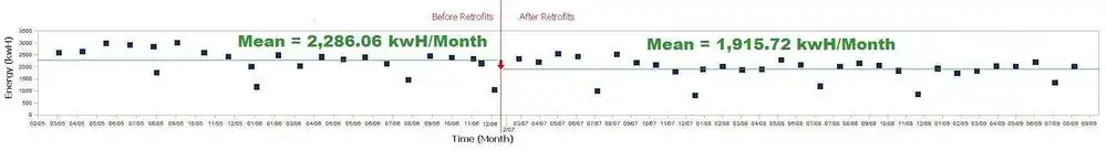 - After taking the mean energy use per month before the retrofits (2,286.06 kwH), we found the mean of the energy used after the retrofits (1,915.72). After subtracting these numbers we were left with a monthly average of 370.34 kwH saved, and a yearly average of 4444.08 kwH.