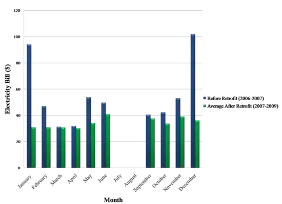 Figure 4 compares Sequoia Humane Society's electricity bill from before the retrofit to after. The graph shows that the humane society's electricty bill did in fact decrease after the retrofits. During the months of December and January the graph shows a spike in the elctricity bill, however data collected included only one year prior to the retrofits, so it is unclear if these values are outliers or not. Please note that no data could be obtained for the months of July and August.