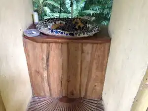 | The hand washing sink is a good example of how broken tiles can be used to make aesthetically pleasing and practical structures. The water from the sink flows into the forest below. | |