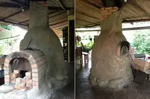 The earthen rocket oven at Rancho Mastatal was originally built as a standard earthen oven. Overtime, they decided that the cooking style of the earthen oven did not fit their needs. Quicker cooking methods were needed. Instead of deconstructing the earthen oven, they decided to reconstruct it as an earthen rocket oven using principles from the rocket stove.
