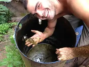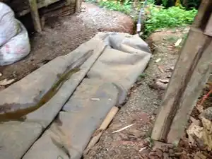| Methane is collected from the anaerobic digestion and piped to the kitchen. This is a bucket between the biodigester and the kitchen used to catch liquid particles that make it through the pipe. | |