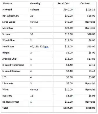 The Arduino chip components of the finish line are rated to last many years of constant use, if however they do require replacement the price will range depending on the component. The Arduino UNO Microcontroller can be found for $12, the LED and Photoresistors tend to be $0.25 each. Repainting the design will all depend on how much damage the exterior takes from the kids playing with the design. If the damage is minor then painting over will only take a few minutes, costing around $5. To repaint the whole design will take longer. The hinge that is attached to the starting mechanism may have to be replaced depending on the amount of use it gets. Kids could pull the handle to hard and over time may become loose and need replacing. This is a simple replacement, and will only take about 5 minutes with a drill and cost around $5.00. Cleaning may need to be done depending on how much debris gets on the tracks, making it difficult for the vehicles to go down the track. A quick sweep or dusting will suffice and only take about 5 minutes. Hot wheel cars will need to be replaced as they are lost, stolen, or broken. These can easily be ordered online for nearly a dollar per car. Golf balls depending on what kind you buy can vary in price, but the cheapest can be found online for about $0.50 each.