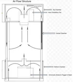 The bottom chamber of the exhibit contains the ultrasonic fogger, a basin filled with water for the fogger, and a compartment housing all the electrical workings. The figure below depicts the approximate layout of the bottom chamber as well as the geometry of both the top and bottom chambers. The ultrasonic fogger creates mist which is contained within a sealed basin. A 4inch diameter tube connects the top of the basin and the central chamber of the exhibit where the vortex is formed. There are ¼ inch holes drilled in the tube which allow air to be pulled through the tube and into the central chamber along with the pooling mist. There are four 1.5inch diameter air inlets in the bottom face of the chamber to allow outside air to flow into the bottom chamber.