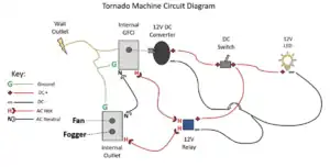The electrical loads of the tornado machine are a 400W ultrasonic fogger, an 85W inline ventilation fan, and 12V LED light strip. The fogger and fan are powered through a line voltage outlet which is in a circuit isolated from the exterior of the exhibit. The line voltage loop is routed through a GFCI and controlled by a 12V relay. A 12V, 1.3 Amp converter is plugged into the GFCI. The converter is connected to a switch which is located on the front of the exhibit. The switch controls a 12V LED light strip and a 12V relay which are run in parallel. When the switch is flipped from off to on the 12V Direct Current flows through the switch, powers the LED light strip, and flips the 12V relay. When the relay is flipped the AC line voltage side of the circuit is powered, and the fan and fogger turn on.