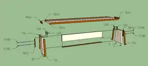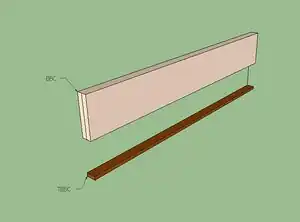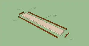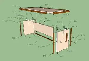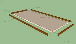 An overview of the Bench top. Glue and clamp/nail the parts TBA1, TBA2, and BTOP together.