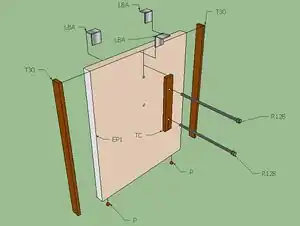 This is the table leg. Glue and nail/clamp T30 to EP1. Glue and nail TC to the center of EP1 and down 3 inches from the top side of EP1. Once TC is mounted, drill corresponding pilot holes for the lag-bolts R12B. Place either homemade or store bought protective pads (P) 2-3 inches in from the ends of EP1.
