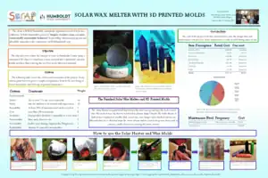 Solar Wax Melter with 3D Printed Molds utilizes 3-D printing capabilities and the energy produced from the Sun to heat and re-purpose crayons, candles, and other waxes. The Solar Wax Melter is constructed out of common waste stream items and up-cycles them into a useful and interesting design whose main function is further up-cycling. This design was created in the Cal Poly Humboldt Engineering 215, for the client, SCRAP Humboldt whose goal is to "inspire creative reuse and environmentally sustainable behavior by providing educational programs and affordable materials to the community."[1]