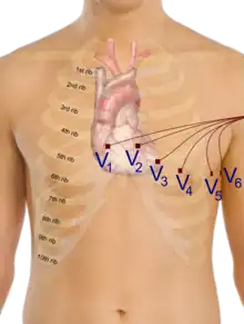 V4- ATTENTION, this lead is placed before V3.This lead is placed along the midclavicular line at the 5th intercostal space.