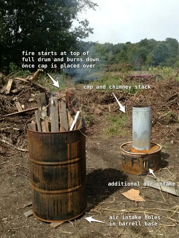 A fire is kindled at the top of the open loaded drum, until a good blaze has begun to spread through the exposed material. Then, the cap piece is fitted over this fire to create a substantial draft through the chimney column.