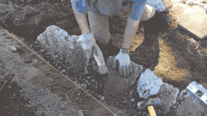 Create a foundation layer by digging out all loose dirt, tamping firm the earth that your first layer of urbanite will be placed on, and level it.