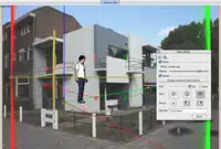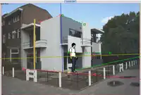 It is intended that we clearify to SketchUp on how the perspective runs in the picture. To do so, we place the green and red axises on the countours of the building. (for example: the ridge of a roof, a gutter, the bottom of the windows, ...). The placement is done by dragging the end points of the red and the green axises. It is also the intention that the origin of the axises (yellow rectangle) is positioned on a logical place: usually on a corner of the building.