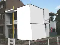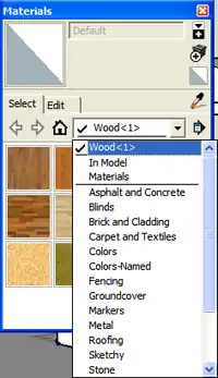 Now the building has been largely drawn, we can apply materials to obtain a more realistic appearance. We use a new tool; the PAINT BUCKET-tool. When you select this tool, SketchUp opens up its materials library (also accessible via Window -> Materials). At the top right is a menu where you can select a materials-category. In the library itself, you select the material that you want to use.