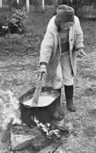 Lye soap can be made on a stove inside or traditionally over a fire outside using an iron kettle. Lye is very strong and dangerous, so use care in preparing the soap.