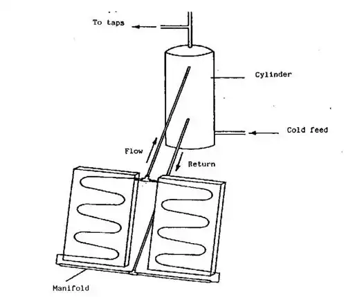 At night it is possible for the collector to lose heat by radiation and the circulation will be in the opposite direction, so the water will cool. This can be overcome by use of a suitable non-return valve. However, there is a danger with solar collectors when used under clear night conditions (e.g. in arid and semi arid regions) that they can actually freeze even when the ambient temperature is above freezing point. In such conditions it may be necessary to have a primary circuit through the collector filled with antifreeze and a separate indirect hot water cylinder where the water from the collector passes through a copper coil to heat the main water supply. This problem will only apply in certain desert regions in the cold season or at high altitudes in the tropics and sub-tropics.
