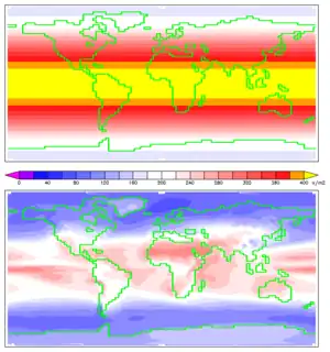 Solar radiation reaches the Earth's upper atmosphere at a rate of 1366 watts per square meter (W/m2).[1] Map A shows how the solar energy varies in different latitudes.