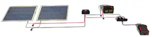 - ↑ At minimum 3 feet each of red and black wire, depending on how far apart you want/need your system components. 10 gauge wire should be thick enough for a system with components a few feet a way. Convention is to use red for positive lines and black for negative lines. See To Catch the Sun for more on sizing.