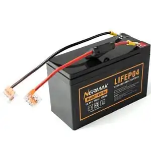 - ↑ Pictured here is the Nermak brand 12 V, 10Ah, 120Wh LiFePO4 battery (Model:12V10A). Any similar 12 V ~10 Ah battery will work (as long as your charge controller matches the battery type. SAFETY NOTE: This is the dangerous part.