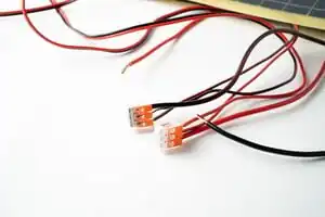 Cut 6 to 12 inches (depending on your desired distance of panels to charge controller) of red and black 10-gauge wire from the wire and strip 3/8 inch from all ends.