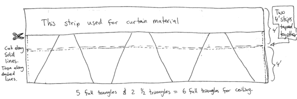 Insulating the ceiling took a little more forethought. At first I was going to use the same method as I used cutting out the roof material. This would entail laying out enough insulation in strips and taping them together so that I could cut out a 20' diameter circle. Then I thought of an even better solution that creates much less waste (< 1 square foot). The roof is comprised of triangles. If you take a set of triangles (in this case 6), any isosceles triangles will do, and flip alternating ones over you'll get a parallelogram. Cut a right triangle off of either end, flip it over, place it on the other end and you've got a perfect rectangle. I started with a perfect rectangle, so just repeat the process in reverse! The 4' wide sheet of insulation was not enough so I laid down two strips, taped them together and cut the triangles out of this. If this sounds complicated don't be alarmed: see diagram below. Also, these were not full triangles because the skylight negated the need for the top portion of each triangle. Therefore an approx. 26" strip was removed from the whole length. Luckily for me this material was the perfect amount I needed to make curtains for my two largest windows.