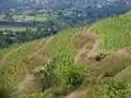 Terraces and ditches prevent erosion on steep slopes and create areas for farming. Terraces and ditches are dug according to the contour of the site and the terraces leave an edge over each trench. Water rather then flowing straight down hill follows the edges of these terraces thus this practice slows down the water and prevents massive soil erosion. If vetiver (a tall perennial grass) is planted in the mounds it helps further prevent erosion as its roots are established deep in the soil to secure it in place. The distance between these trenches depends on the slope. Petegral has demonstration of teracing both with vegitation as well as terracing using rock wall borders. This is one project in a series of soil conservation, groundwater recharge, and farming demonstration projects at the Permaculture Demonstration Center in San Andres Huayapam, Mexico, called Pedregal.
