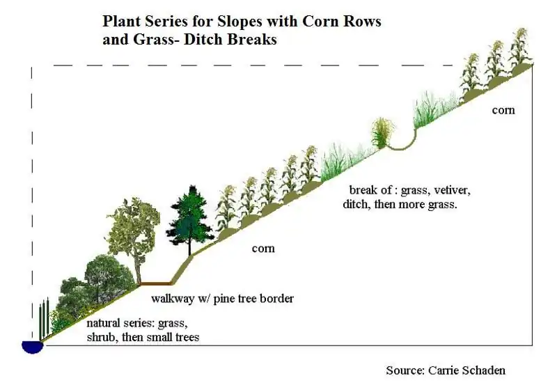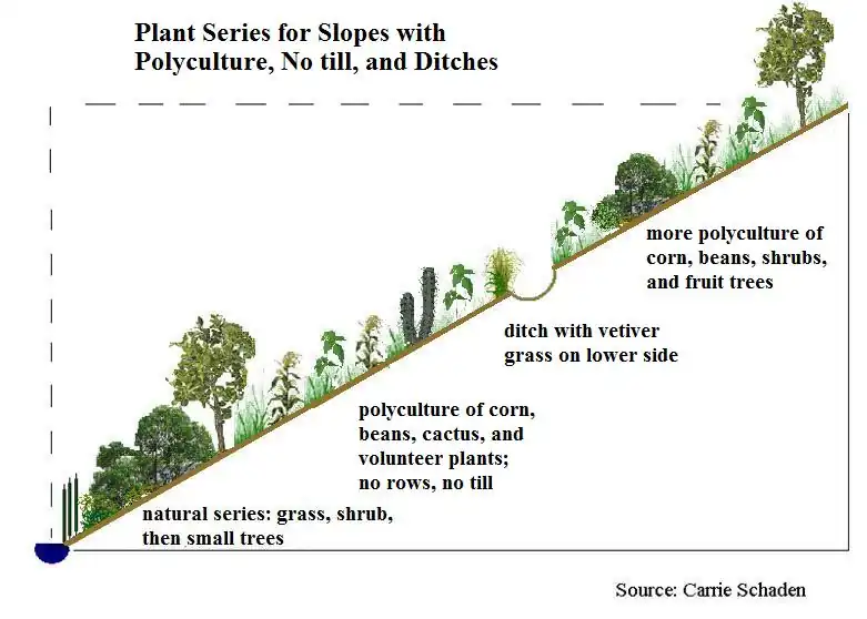 • the polyculture mix is repeated and then again followed by another ditch all the way up the hill