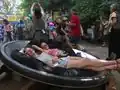 Imagine .... one shape that is capable of providing the most basic functions necessary for sustaining the lives of people caught up in natural disasters, the forced migrations of an ethnic cleansing, war and revolution; a shape that is able to function as the essential components of a refugee cart, including wheels, cart bed and secure cover top; serve as a large rolling shield, a satellite telecommunications dish and internet up-link, a parabolic lens capable of igniting wood kindling in 1 second, a high temperature solar cooker, able to thermally pasteurize 2 gallons of drinking water at 160 f in 30 minutes and boil 2 gallons in under an hour, an emergency flood light reflector or signal beacon, a strong shelter roof with an IR reflective ceiling, a large cushioned papasan shaped lounge chair or bed frame, a rain water catchment, a cold plunge, and bath tub. In short, an all in one disaster refugee survival tool that can be stacked as nested bowls on parachuted pallets and airdropped to fleeing refugees from C-17 cargo jets within 24 hours as part of a Rapid Aid Deployment (R.A.D.). (Beyond C-17s, a more efficient delivery system will require the use of Cargo Lifters , lenticular airships with ultra quite all solar powered electric motors. The size of the Super Dome, they would be able to transport as much aid-cargo as a small freighter but at speeds approaching 250 mph and deliver aid directly to remote locations, without need of roads, ports or runways. These flying freighters would also be able to shade and shelter columns of migrating refugees from sun and rain as they journey on foot to distant refugee camps. The helium containing hull/envelope would also be designed to be photovoltaic by incorporating Bucky-tubes into its molecular structure and would thus be able generate over 50,000 watts of electrical power to run its quiet electric motors and to supply power for emergency lighting, communications and medical services.)