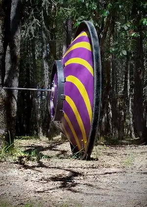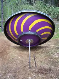 - Design and fabricate a collared fork assembly which positions the bike wheel pot support in a similar gimbaled fashsion but which permits the pot to be self righting using a counter weight as the dish is oriented toward the correct azimuth of the sun by rolling along a cirrcular path while pivoting about the point where the axle/support stand rests on the ground. The collar would slip fit onto the portion of the axle the protrudes through the hub to the concave side of the dish. This would free up the space where the conduit struts of the pot support now span the diameter of the dish at the rim plane.