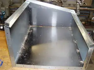 Use the flange holes cut in the insulation to determine where the flanges will be secured to each of the side walls. Mark the flange’s perimeter and the locations of its holes onto the sheet metal. Drill into the sheet metal at the locations of the flange’s holes so that stainless steel bolts can fit through. Use the stainless steel bolts, washers, and nuts to secure the first flange to the side wall that is already riveted into the box’s structure.