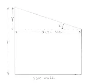 The metal can be cut using metal shears. The dimensions will vary, depending on the angle that the glazing will be set at. The base and front wall likely will be the same dimensions as The Solar Swing’s, while the two side walls and the back wall will vary. Base – 23.75” x 30” Front Wall – 9” x 30” Two Side Walls – 23.75” x 9” x 24.25” x 14” Back Wall – 14” x 30” Use trigonometry to determine the height of the back wall. An imaginary triangle is created if you draw a horizontal line from the upper corner where the front wall and side wall meet across to the back wall. The base of this triangle is the width of the oven (23.75”), and the angle z is the angle that the glazing will be set at (see Figure 2). The height of the triangle (Y) can be determined by the following equation: Y = 23.75 * tan z The height of the back wall should be: H = 9 + Y Lay out the five pieces once you are finished (Figure 3).